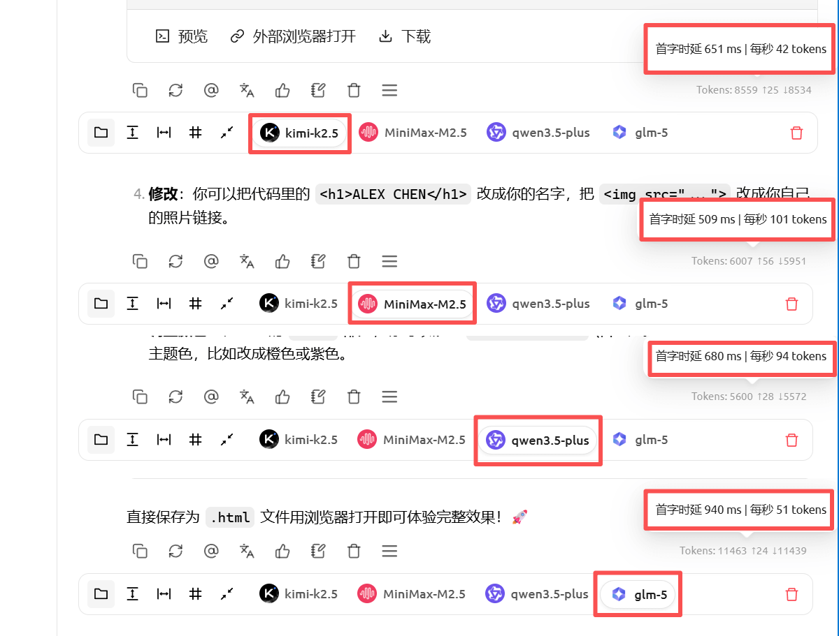 测试时间为晚间 22:00 时段,参数量较小的 qwen3.5-plus、MiniMax-M2.5 模型速度非常快;而 kimi-k2.5、glm-5 模型也达到了40 ~ 50 tokens/秒,整体体验不错!(测试仅作为参考)