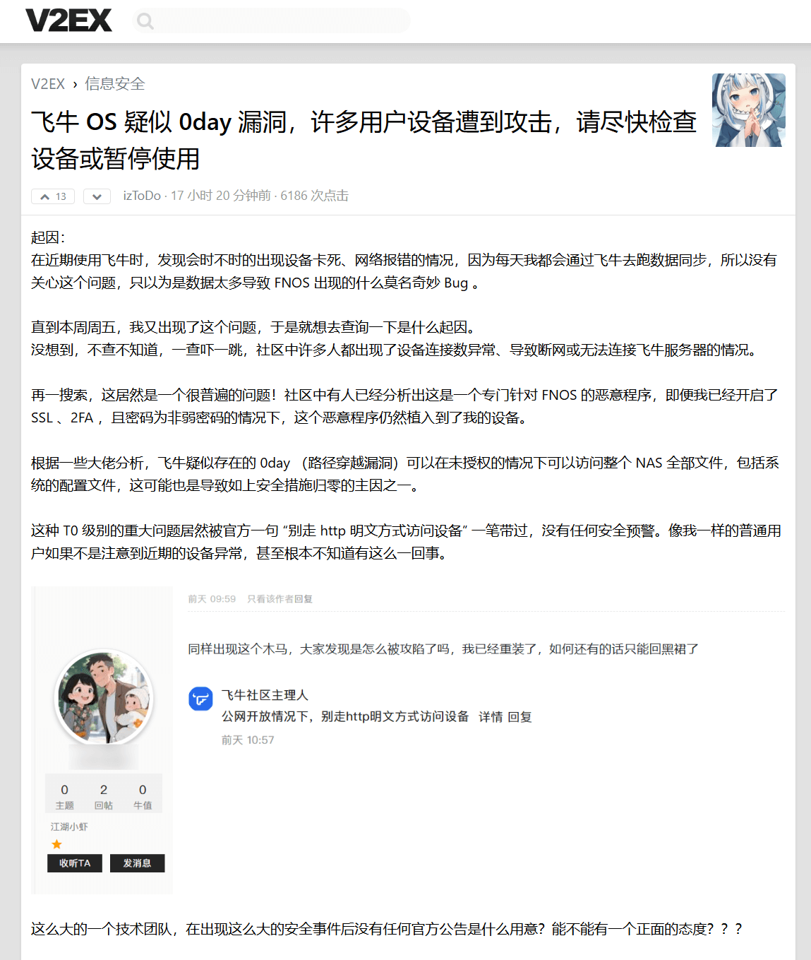 今天凌晨开始,有帖子陆续在讨论 飞牛 fnOS 存在 0Day 漏洞:
