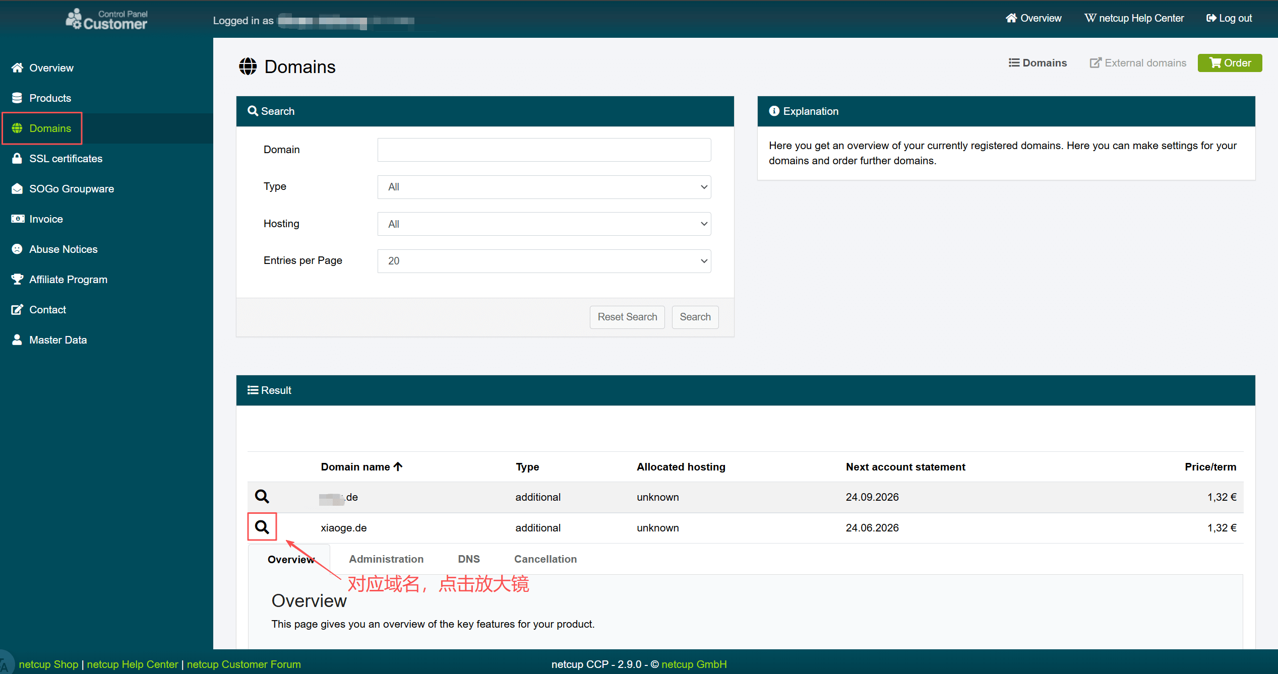 打开 ccp 控制台 → Domains(域名菜单),点🔍展开域名选项